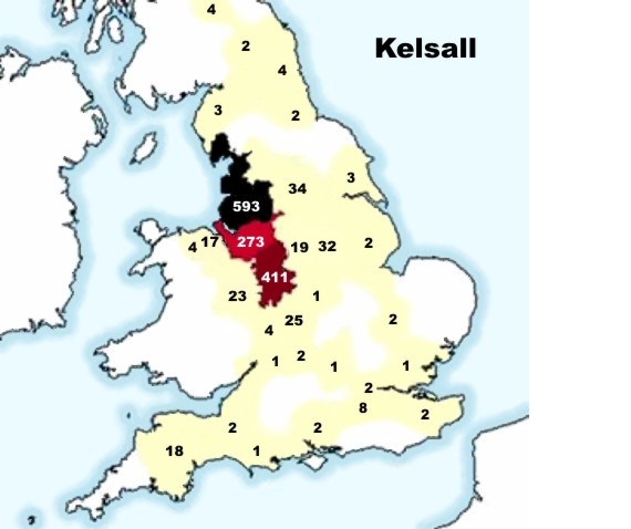 Over half of all Kelsall households in the U.K. are in three counties, Staffordshire, Lancashire and Cheshire. In the USA, Kelsall is such a rare name that it is not found in the list of the 88,799 most common names found by the official Census. If you have any information to add to these numbers please e-mail me at kelsall@q.com.